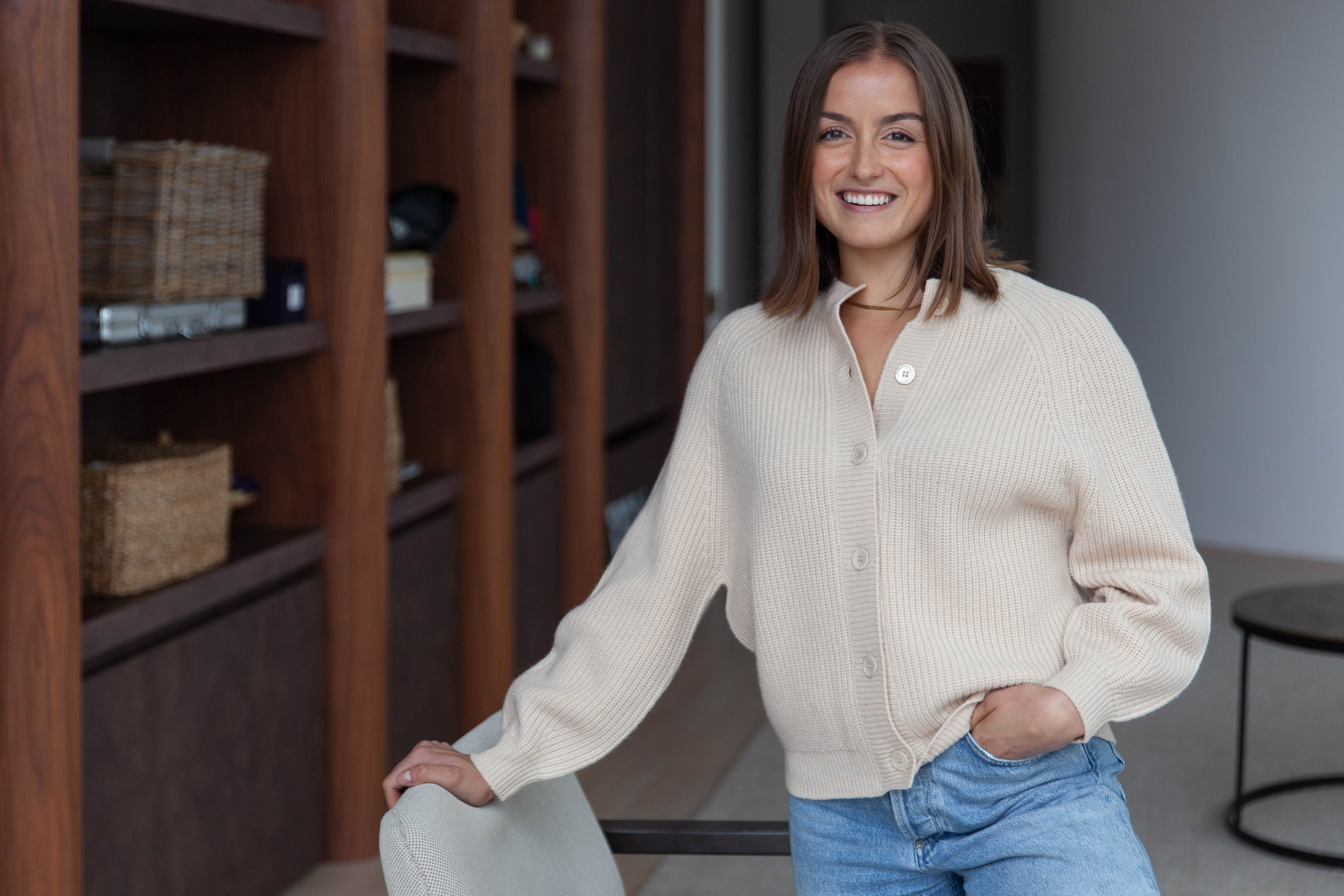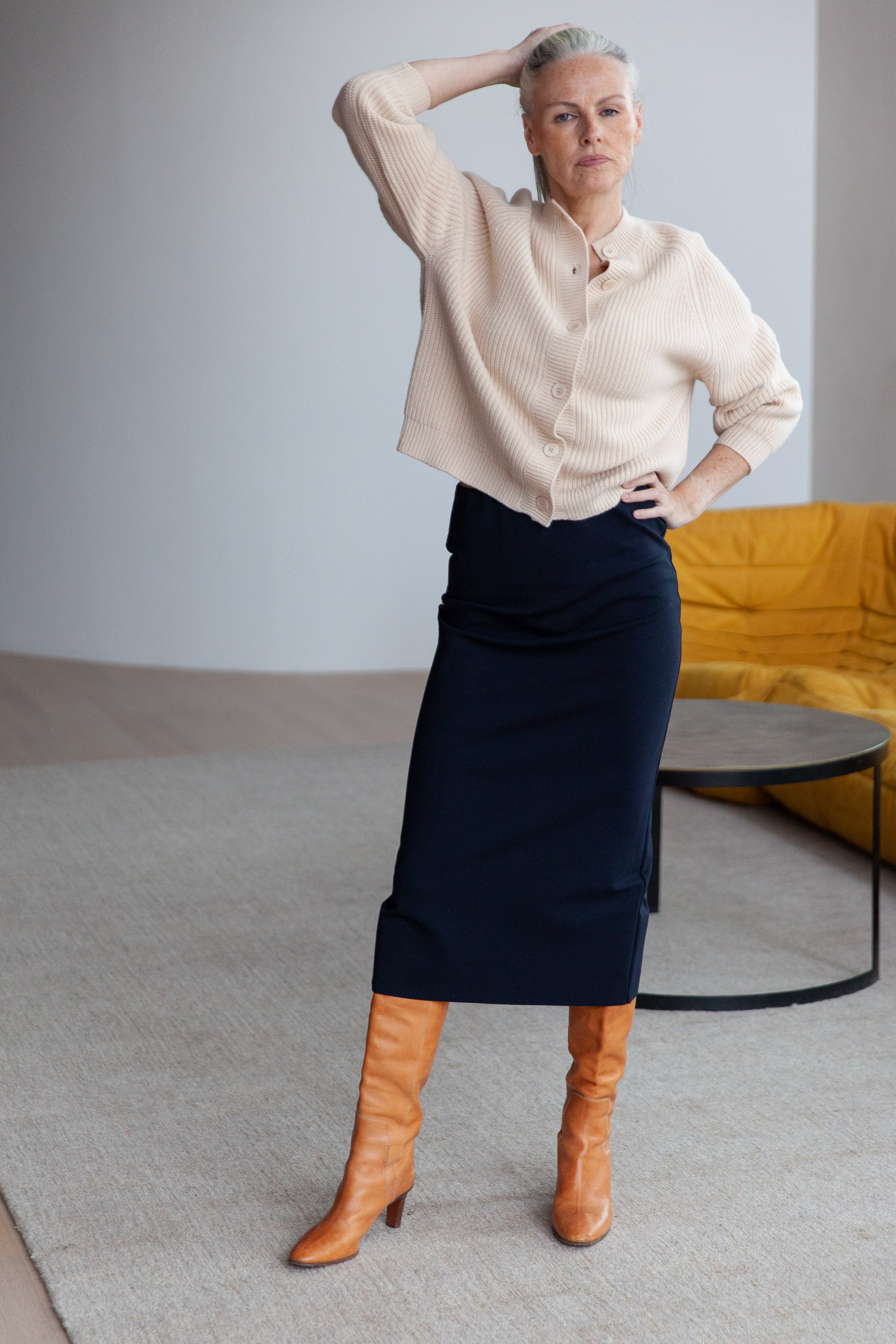 Tricoté en maille 4 fils, ce cardigan 100 % cachemire révèle un beau relief en côtes anglaises : plus dense, plus chaud, avec un tombé structuré. Sa patte boutonnée, son col V adouci et ses manches raglan légèrement bouffantes en font une pièce cosy et moderne, à porter ouverte sur une chemise ou fermée comme un pull.