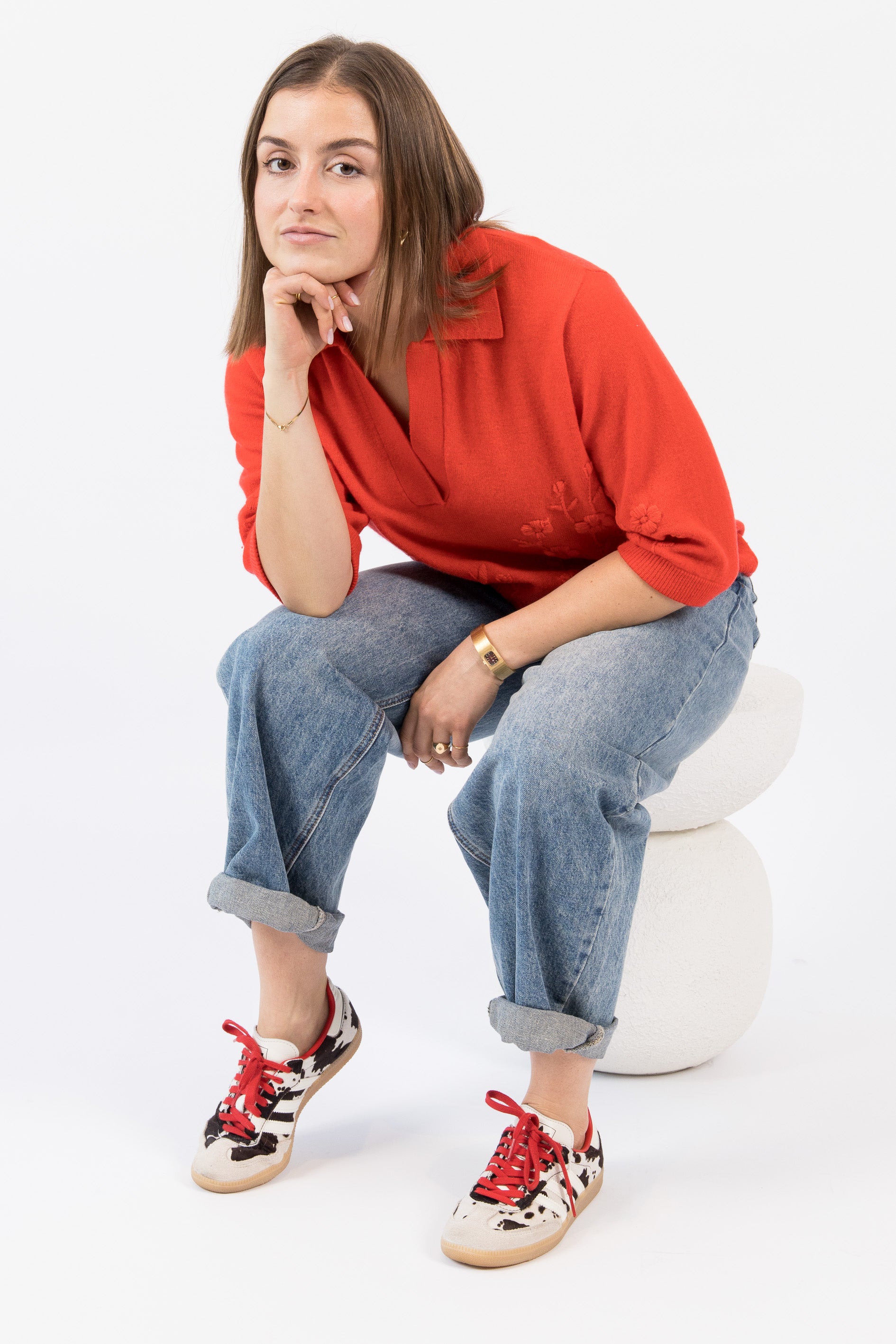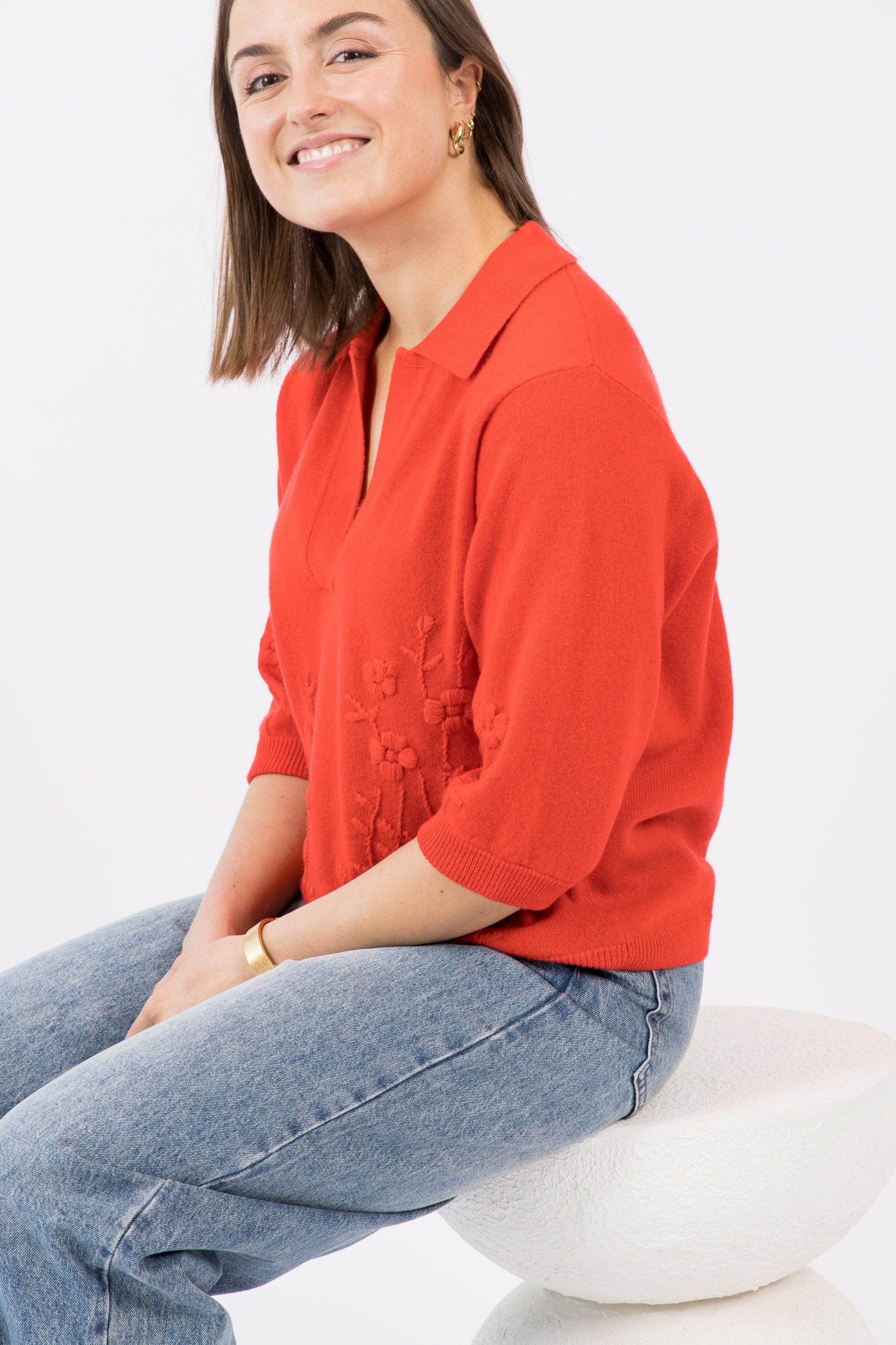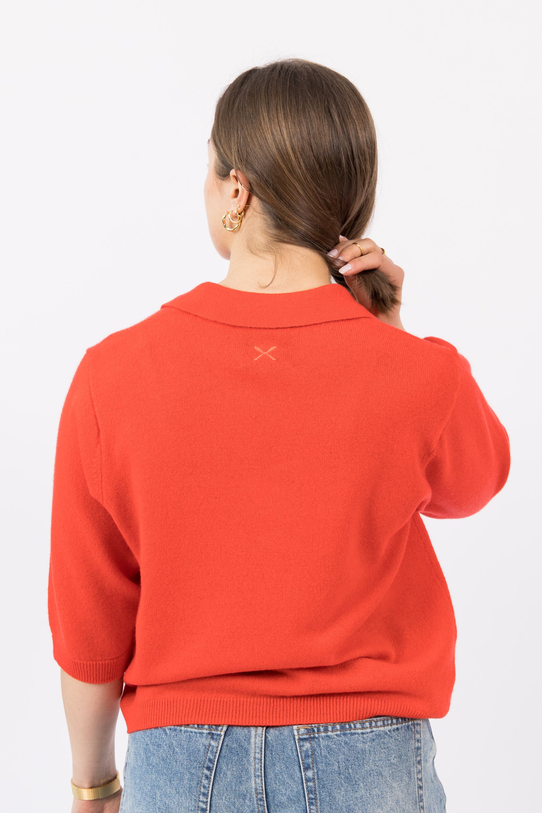 Égayez votre garde-robe avec notre pull col polo brodé à la main, confectionné en cachemire 100 % de qualité supérieure en coloris tomate. Alliant élégance intemporelle et confort exceptionnel, ce modèle est parfait pour toutes les occasions.